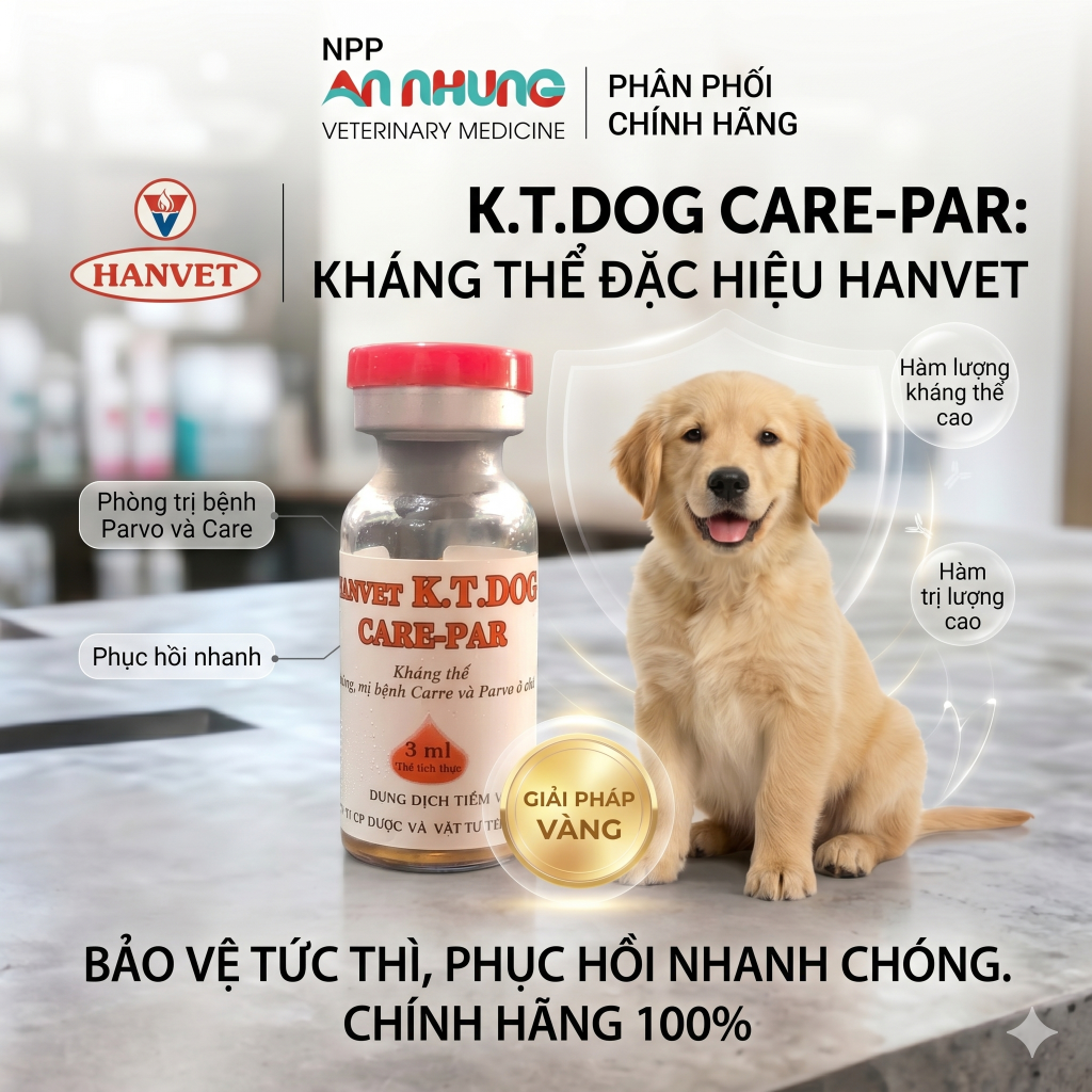 Bạn đang lo lắng khi thấy cún cưng bỏ ăn, nôn mửa hoặc tiêu chảy ra máu? Đây có thể là dấu hiệu của hai căn bệnh tử thần: Parvo và Care. Đừng chần chừ, hãy trang bị ngay Kháng thể K.T.DOG CARE-PAR – giải pháp hỗ trợ xử lý virus trực tiếp từ Hanvet.