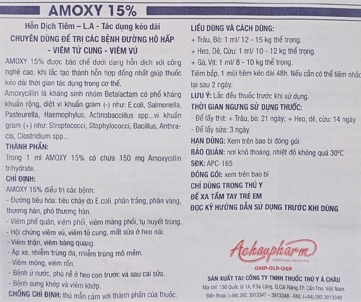 Trong 1 ml AMOXY 15% có chứa 150 mg Amoxycillin trihydrate. 💥