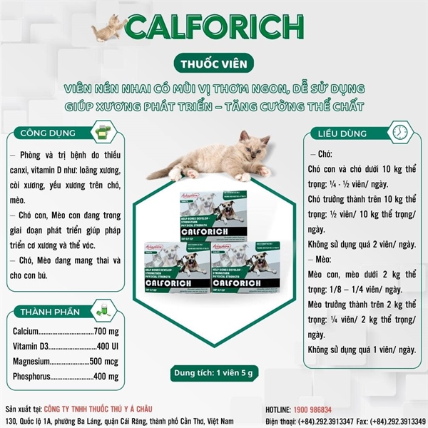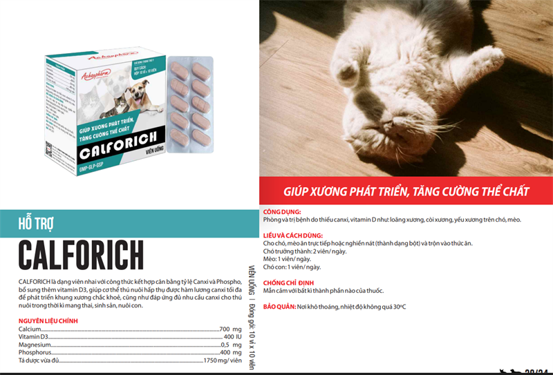 Cách dùng: Sử dụng theo liều cao hơn trong khoảng liều khuyến nghị (đến liều tối đa cho phép) và duy trì cho đến khi tình trạng bệnh được cải thiện rõ rệt hoặc theo chỉ định của bác sĩ thú y. Ví dụ, chó con dưới 10kg có thể dùng 1 viên/ngày nếu có dấu hiệu còi xương.
