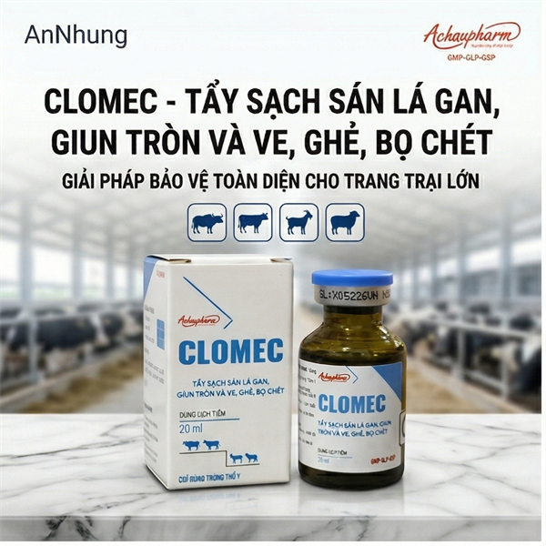 Sản phẩm CLOMEC đến từ thương hiệu uy tín Achaupharm, là sự kết hợp hoàn hảo giữa Ivermectin và Clorsulon. Đây được coi là bước đột phá giúp bà con chăn nuôi giải quyết triệt để các vấn đề về ký sinh trùng cứng đầu, đặc biệt là sán lá gan và dòi da trên gia súc lớn.
