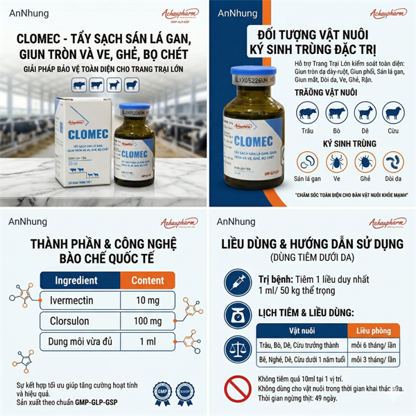 Dung Dịch Tiêm Achaupharm CLOMEC – Hỗ Trợ Xử Lý Sán Lá Gan, Giun Tròn, Ve, Ghẻ Cho Gia Súc
