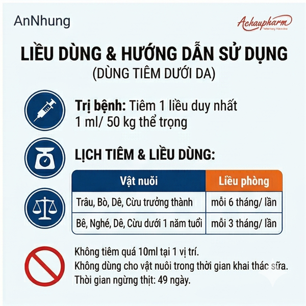Liều lượng: 1 ml / 50 kg thể trọng (Tiêm 1 liều duy nhất).