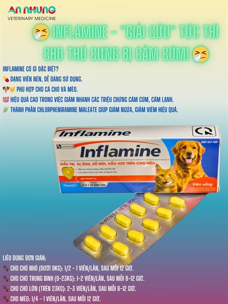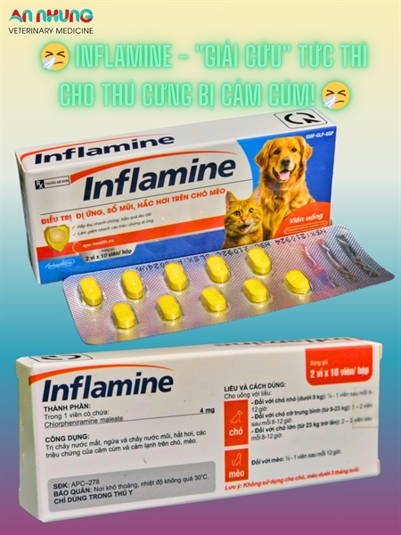 Inflamine không chỉ là một sản phẩm, mà còn là giải pháp toàn diện giúp thú cưng của bạn nhanh chóng phục hồi sức khỏe. Với thành phần Chlorpheniramine maleate, Inflamine giúp giảm nhanh các triệu chứng cảm cúm, cảm lạnh, mang lại cuộc sống thoải mái hơn cho thú cưng của bạn.