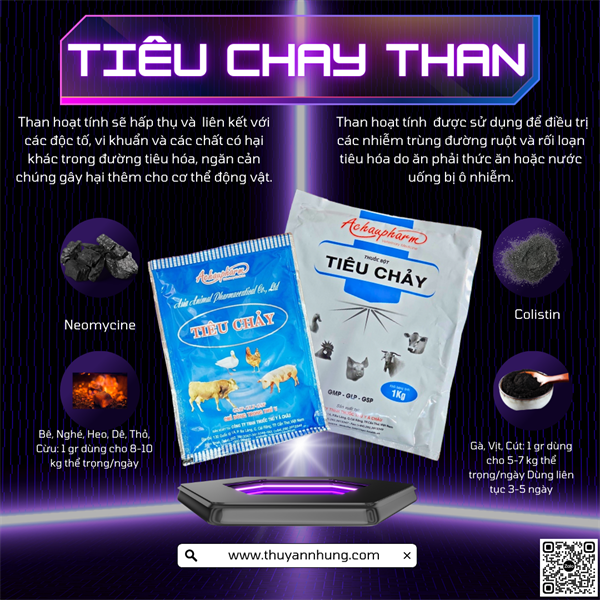 Hấp phụ độc tố (Than hoạt tính): Như một thỏi nam châm, than hoạt tính hút sạch các độc tố và chất lỏng dư thừa trong ruột, giúp gom phân nhanh, khô chuồng và bảo vệ niêm mạc ruột.