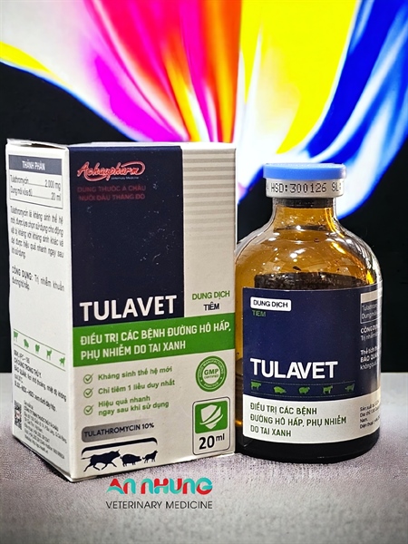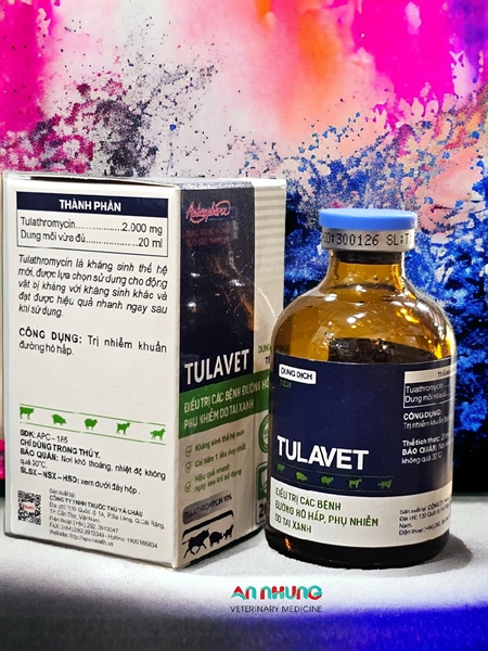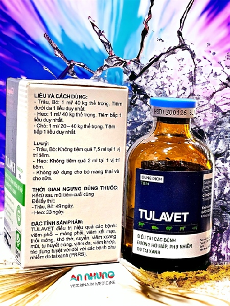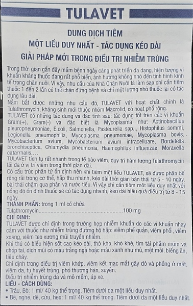 DUNG DỊCH TIÊM MỘT LIỀU DUY NHẤT – TÁC DUNG KÉO DÀI GIẢI PHÁP MỚI TRONG ĐIỀU TRI NHIỄM TRÙNG …100 mq Trong thời gian gần đây mầm bệnh ngày càng phát triển đa dạng, hiện tượng vi n khuẩn kháng thuốc đang rất phổ biến, ảnh hưởng không nhỏ đến tình hình kin tê trong chăn nuôi. Vì vây, nhu cầu của Nhà Chăn Nuôi là làm sao chỉ cần tiêm thuốc 1 đến 2 lần có thể chăn đứng bệnh và chỉ một lương nhỏ thuốc lại có tác ) dụng lâu dài, Nằm bắt được những nhu cầu đó, TULAVET với hoạt chất chính là Tulathromycin, kháng sinh mới thuộc nhóm Macrolid, có hoạt phố rộng. TULAVET có những tác dung và đắc tính sau: tác dụng tốt trên các vi khuấn Gram(+), Gram(-) và đắc biết là Mycoplasma như: Actinobacillus pleuropneumoniae, E.coli, Šalmonella, Pasteurella spp.., Histophilus sommi, Legionella pneumophilia, Mycoplasma pneumoniae, Mycoplasma bovis, Mycobacterium avium. Mycobacterium avium intracelluare, Bordetella bronchiseptica, Chlamydia pneumonia, Haemophilus influenzae, Moraxella catarrhalis….. TỤLAVET tích tu rất nhanh trong tế bào viêm, duy trì hàm lương Tulathromycin tối đa ở vị trí viêm trong thời gian dài. Có cấu trúc phân tử ổn định nên khi tiêm một liều TULAVET, sẽ rộng rãi trong cơ thể, hấp thu nhanh, kéo dài thời 5 – 10 ngày, bài th thải châm qua phân và nước tiểu. Vì vây chỉ cần tiêm một liều duy nhất với. gian bán thải tược phân bố nồng độ ổn định thuốc sẽ có tác dụng nhanh, kéo dài hiệu quả điều trí từ 8 – 15 ngày. THÀNH PHẦN: trong 1 ml có chứa Tulathromycin… CHỈ ĐINH: TULAVET được chỉ định trong trường hợp nhiễm khuẩn do các vi khuần nhay – cảm với thuốc như nhiễm trùng đường hô hấp: viêm phế quản, viêm phổi, viểm xoang, viêm teo xương mũi truyền nhiễm. Khi thú có biểu hiên sốt cao kéo dài, thở khó, khò khè, tím tái phẩm m m và chóp tai, dịch mũi có màu trắng ngà hoặc màu xanh như mủ, mệt mỏi, biếng ăn, tiêu chảy. Chỉ định trong điều trị viêm khớp, viêm kết mạc mắt gây đỏ và phồng ở mắt, viêm da, tu huyết trùng, phó thương hàn, suyền. Điều trị nhiễm trùng da và mô mềm, áp xe. LIỂU – CÁCH DÙNG: • Trâu, Bò: 1 ml/ 40 kg thể trong. Tiêm dưới da một liều duy nhất. • Bê, nghé, dê, cừu, heo: 1 ml/ 40 kg thế trọng. Tiêm dưới da một liều duy nhất.