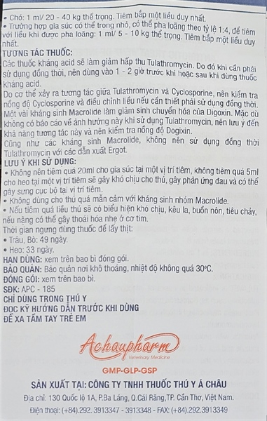 Chó: 1 ml/ 20 – 40 kg thể trọng. Tiêm bạp một liều duy nhất • Trường hợp gia súc có thể trong nhỏ, có thê pha loãng theo tỷ lệ 1:4, để tiêm – với liều khi được pha loãng: 1 ml/ 5- 10 kg thể trọng. Tiêm bắp một liều duy nhất. TƯƠNG TÁC THUỐC: cắc thuốc kháng acid sẽ làm giam hạp thu Tulathromycin. Do đó khi cần phải sử dùng đồng thời, nên dùng vào 1 – 2 giờ trước khi hoặc sau khi dùng thuốc kháng acid. Do cơ thể xây ra tương tác giữa Tulathromycin và Cyclosporine, nên kiểm tra nồng đô Cyclosporine và điều chỉnh liều nêu cần thiết phải sử dụng đồng thời . Một vài kháng sinh Macrolide làm giảm sinh chuyển hóa của Digoxin. Mặc dù a không có báo cáo về ảnh hưởng này khi sử dụng Tulathromycin, nên lưu ý đến khả năng tương tác này và nên kiểm tra nông đô Dogixin. Cũng như các kháng sinh Macrolide, không nên sử dụng đồng thời Tulathromycin với các dẫn xuất Ergot. LƯU Ý KHI SỬ DUNG: . Không nên tiêm quá 20mi cho gia súc tại một vị trí tiêm, không tiêm quá 5ml. cho heo tại một vị trí tiêm sẽ gây khó chịu cho thú, gây phản ứng đau và có thể gây sưng cục bộ tai vi trí tiêm. . Không dùng cho thú quá mân cảm với kháng sinh nhóm Macrolide,. • Nếu tiêm quá liều thú sẽ có biểu hiện khó chịu, kêu la, buồn nôn, tiêu chảy.. nếu năng có thể gây thoái hóa nhe ở cơ tim. Thời gian ngưng dùng thuốc để lấy thịt: • Trâu, Bò: 49 ngày. • Heo: 33 ngày. HAN DÙNG: xem trên bao bì đóng gói. BẢO QUẢN: Bảo quản nơi khô thoáng, nhiệt độ không quá 30°C.. ĐÓNG GÓI: xem trên bao bì. SĐK: APC – 185 CHỈ DÙNG TRONG THỦ Y ĐỌC KỸ HƯỚNG DÂN TRƯỚC KHI DÙNG ĐỀ XA TẦM TAY TRẺ EM