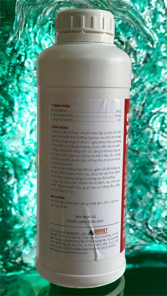 Cyanocobalamin (Vitamin B12): Cần thiết cho quá trình tạo máu, kích thích chuyển hóa protein và chất béo, giúp vật nuôi ăn ngon, tăng trọng tốt và cải thiện ngoại hình (hồng da, mượt lông).