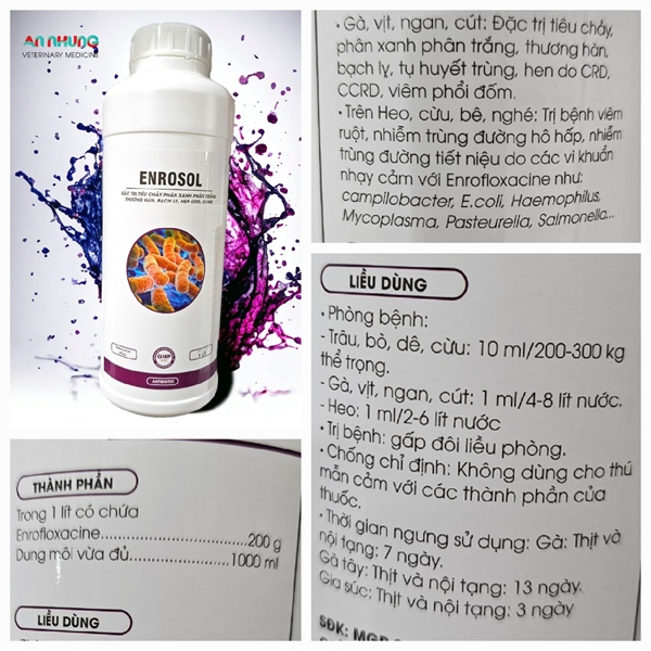 • Trên Heo, cừu, bê, nghé: Trị bệnh viêm ruột, nhiễm trùng đường hô hấp, nhiễm trùng đường tiết niệu do các vi khuẩn nhạy cảm với Enrofloxacine như: campilobacter, E.coli, Haemophilus, Mycoplasma, Pasteurella, Salmonella…