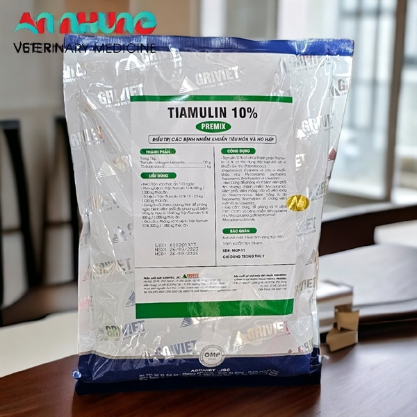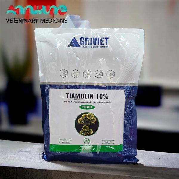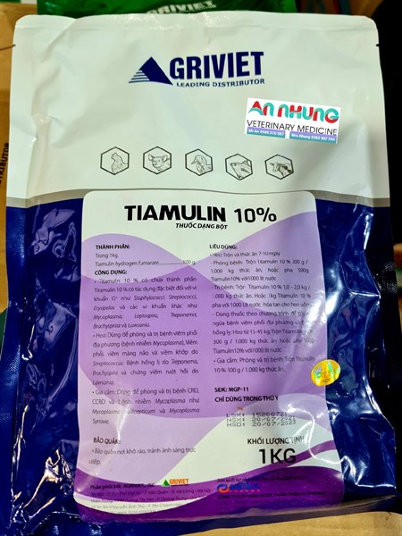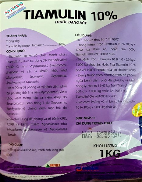 🐷 Trị bệnh: Trộn Tiamulin 10% 1.0 – 2.0kg / 1.000kg thức ăn. Hoặc 1kg Tiamulin 10% pha với 1000 lít nước hòa tan cho heo uống.