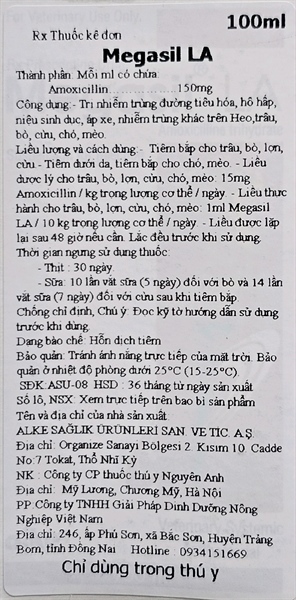 Liều thực hành: 1ml Megasil LA/10kg trọng lượng cơ thể/ngày