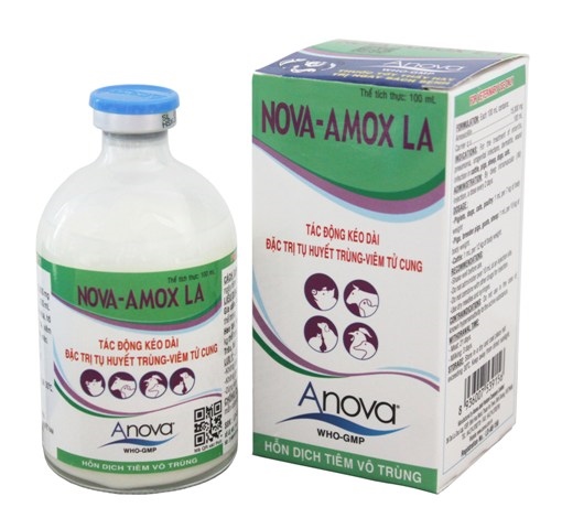 NOVA-AMOX LAGiới thiệuĐẶC TRỊ VIÊM PHỔI – VIÊM TỬ CUNGTHÀNH PHẦN:AmoxicillinCÔNG DỤNG:Đặc trị viêm phổi cấp tính, viêm vú, viêm tử cung, nhiễm trùng đường tiểu, nhiễm trùng vết thương, viêm da có mủ, tụ huyết trùng, thương hàn trên heo, trâu, bò, dê, cừu, chó, mèo và gia cầm.CÁCH DÙNG:Tiêm sâu vào bắp thịt, 2 ngày tiêm 1 lần.LIỀU DÙNG:Gia cầm, heo con, chó mèo: 1 mL/ 7 kg thể trọng.Heo thịt, heo giống, dê, cừu: 1 mL/ 10 kg thể trọng.Trâu, bò: 1mL/ 12 kg thể trọng.LƯU Ý:Lắc kỹ trước khi sử dụng.Không tiêm quá 10 mL tại 1 vi trí tiêm.Không pha với thuốc khác để tiêm.Dùng kim tiêm và ống tiêm khô để tiêm.Ngưng sử dụng thuốc 21 ngày trước khi giết mổ, 3 ngày trước khi khai thác sữa.BẢO QUẢN:Nơi khô mát không quá 300C. Tránh ánh sáng trực tiếp.