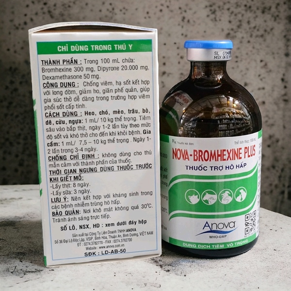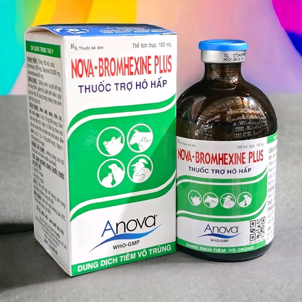 NOVA-BROMHEXINE PLUSGiới thiệuTHUỐC TRỢ HÔ HẤPTHÀNH PHẦN:BromhexineDipyroneDexamethasoneCÔNG DỤNG : Chống viêm, hạ sốt kết hợp với long đờm, giảm ho, giãn phế quản, giúp gia súc thở dễ dàng trong trường hợp viêm phổi sốt cấp tính.CÁCH DÙNG : Heo, chó, mèo, trâu, bò, dê, cừu, ngựa: 1 mL/ 10 kg thể trọng. Tiêm sâu vào bắp thịt, ngày 1-2 lần tùy theo mức độ sốt và khó thở cho đến khi khỏi bệnh.LƯU Ý: Nên kết hợp với kháng sinh trong các bệnh nhiễm trùng hô hấp.BẢO QUẢN :Nơi khô mát không quá 300C. Tránh ánh sáng trực tiếp.