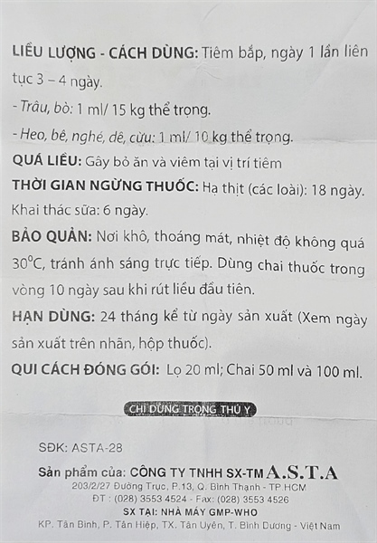 – Heo, bê, nghé, dê, cừu: 1 ml/10 kg thể trọng.