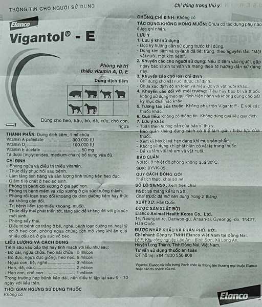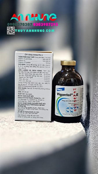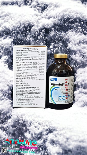 100 ml chứaVitamin A Palmitate……………………….30.000.000 IUVitamin D3…………………………………… 10.000.000 IUVitamin E (a-tocopherol acetate) ……5 gCHỈ ĐỊNH- Phòng ngừa và điều trị thiếu vitamin.- Thúc đẩy phục hồi sau bệnh.- Làm tăng tính hăng và sản lượng tinh trùng trên heo đực.- Giảm tỉ lệ chết ở heo sơ sinh.- Phòng trị bệnh còi xương ở gia súc non.- Phòng trị bệnh mềm và xốp xương ở gia súc trưởng thành.- Phòng rối loạn trao đổi khoáng do dinh dưỡng kém hay thức ăn không cân đối.- Trị bệnh liếm (do thiếu khoáng, muối)- Thúc đẩy thai phát triển tốt, tăng sức đề kháng đối với gia súc mới sinh- Phòng sẩy thai- Điều trị bệnh cơ trắng ở bê, nghé, bệnh loạn dưỡng cơ, hoại tử cơ ở heo con, phòng ngừa chứng tích mỡ vàng khi ăn quá nhiều dầu cá ở gia súc vỗ béo. LIỀU LƯỢNG VÀ CÁCH DÙNGVigantol® – E tiêm sâu vào bắp thịt hay tĩnh mạch với liều như sau:- Bò cái, ngựa chửa, heo nái chửa: 5ml/ con- Bò đực, ngựa đực giống, heo nọc: 5ml/ con- Ngựa con, bê, nghé: 3 ml/ con- Heo, dê, cừu: 2ml/ con- Heo con, chó con: 1ml/ con