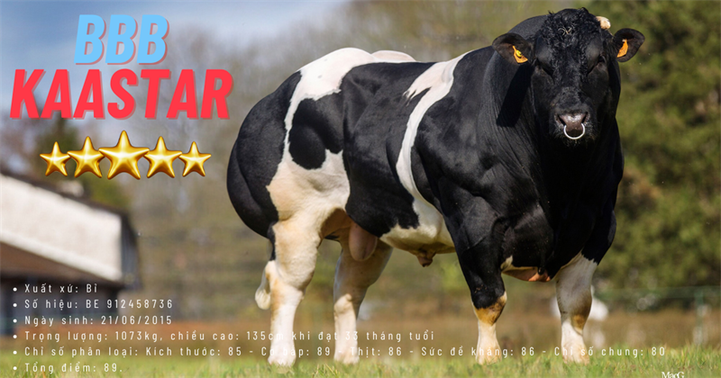 Đây là dòng bò 3B (Blanc Bleu Belge) nhập khẩu chính ngạch, nổi bật với màu lông Bông Đen (Noire & Blanche) ấn tượng và chỉ số hình thể thuộc hàng Top.