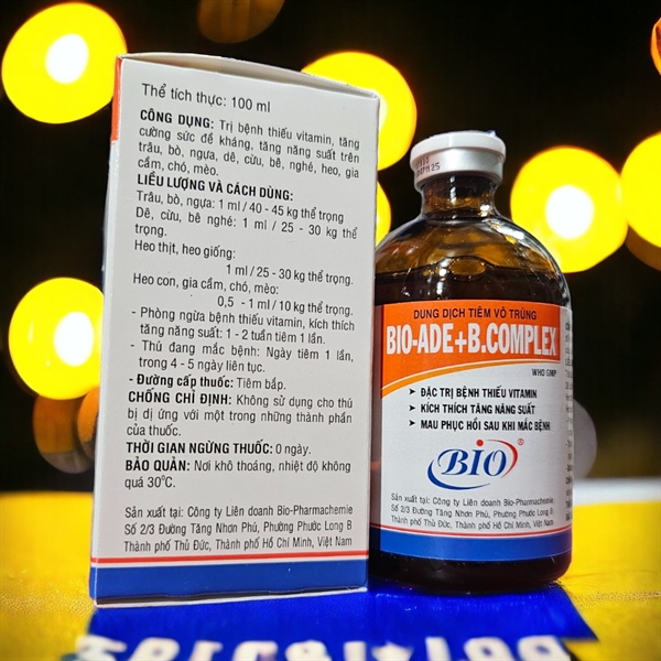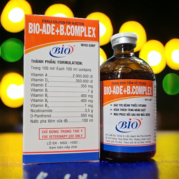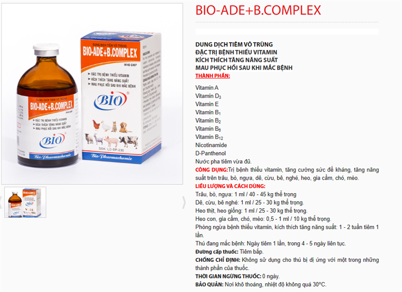 Bạn muốn vật nuôi nhanh lớn, ít bệnh, tăng cường sức đề kháng vượt trội và phục hồi nhanh sau khi ốm? BIO-ADE+B.COMPLEX là giải pháp tiêm vô trùng, cung cấp tổ hợp Vitamin thiết yếu cho mọi loại gia súc, gia cầm.