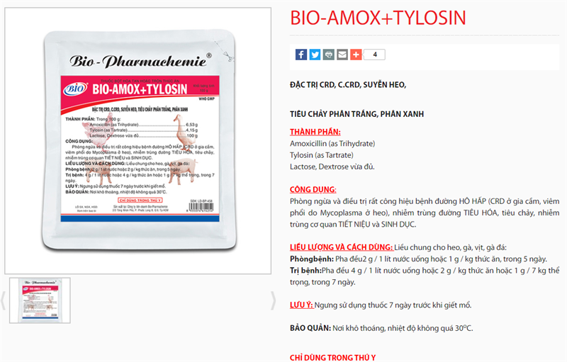 Phòng bệnh: 2g / 1 lít nước hoặc 2g / kg thức ăn, dùng trong 5 ngày. 🐔🐖🐄