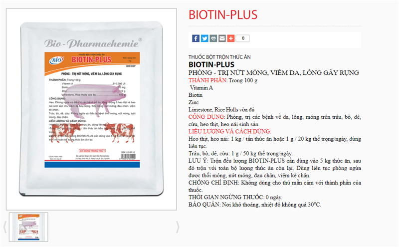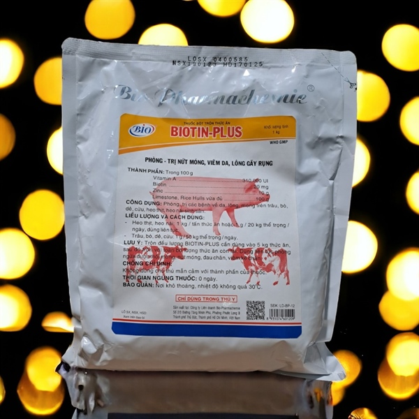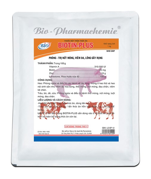 BIOTIN-PLUSTHUỐC BỘT TRỘN THỨC ĂNBIOTIN-PLUS PHÒNG – TRỊ NỨT MÓNG, VIÊM DA, LÔNG GÃY RỤNGTHÀNH PHẦN:Vitamin ABiotinZincCÔNG DỤNG:Cung cấp vitamin, khoáng chất, trị bệnh về lông, da.LIỀU LƯỢNG VÀ CÁCH DÙNG:Heo thịt, heo nái: 1 k