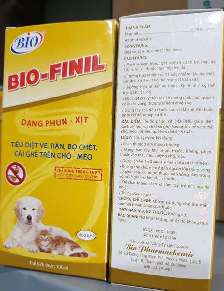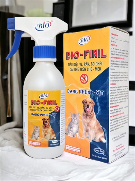 ĐẶC ĐIỂM: Thuốc phun xịt BIO-FINIL giúp diệt sạch ve, rận, bọ chét và ghẻ Sarcoptes trên cơ thể chó, mèo với hiệu quả kéo dài 4 – 6 tuần.LƯU Ý: Lắc kỹ trước khi dùng.