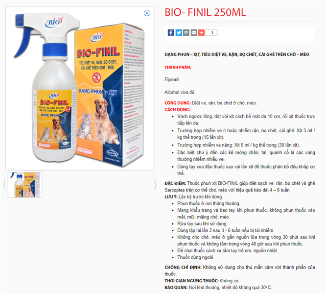 THÀNH PHẦN: Fipronil – Alcohol vừa đủCÔNG DỤNG: Diệt ve, rận, bọ chét ở chó, mèo.