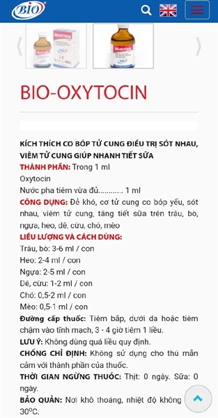 CÔNG DỤNG: Đẻ khó, cơ tử cung co bóp yếu, sót nhau, viêm tử cung, tăng tiết sữa trên trâu, bo, ngựa, heo, dê, cừu, chó, mèo