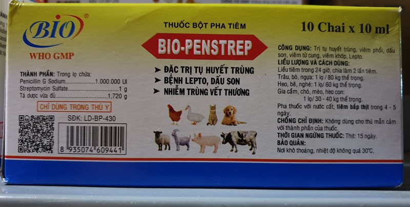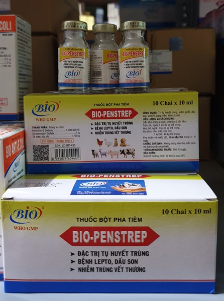 Penicillin G SodiumStreptomycin SulfateCÔNG DỤNG: Trị tụ huyết trùng, viêm phổi, dấu son, viêm tử cung, viêm khớp, Lepto, nhiễm trùng vết thương ở gia súc, gia cầm.