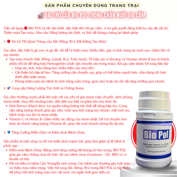 Việc sử dụng 🔴 BIO POL là rất cần thiết, đặc biệt đối với gia cầm, vì nó giải quyết đồng thời ba vấn đề cốt lõi: Thiếu máu/Tạo máu, Nhu cầu Năng lượng tức thời, và Sức đề kháng chống lại bệnh ghép.