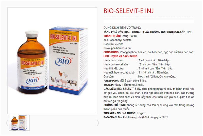 Heo con sơ sinh: 1 ml / con / lần. Tiêm bắpHeo con sau cai sữa- 2 ml / con / lần. Tiêm bắp.Heo thit, de, Cừu : 3 – 4 ml / con / lần. Tiêm bắpHeo nái, heo nọc, trâu, bò:6 – 10 ml / lần. Tiêm bắp. Gia cầm: Hòa 1 ml / 2 lít nước, cho uống.Phòng bệnh: Mỗi 2 tuần dùng 1 liễu.Trị bệnh: Ngày 1 lần trong 3 ngày.ĐẶC ĐIỂM: BIO-SELEVIT-E INJ giúp phòng ngừa và điều trị bệnh thoái hóa cơ gây yếu chân, bại liệt chân, bệnh ngộ độc sắt trên heo con, các trưởng hợp rối loạn sinh sản: Vô sinh, sảy thai, chết non trên gia súc, giảm tỉ lệ ấp nở trên gà, vịt giống