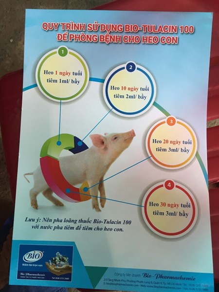 1 Ngày tuổi Liều dùng1 ngày tuổi 1 ml/ bầy10 ngày tuổi 2 ml/ bầy20 ngày tuổi 3 ml/ bầy30 ngày tuổi 3 ml/ bầyLưu ý: Do hàm lượng thuốc đậm đặc, nên pha loãng Bio-Tulacin 100 với nước pha tiêm đặc dụng của Bio trước khi tiêm cho heo con.Bê, nghé: 1ml/ 40 kg thể trọng, cách 10 ngày tiêm 1 lần.