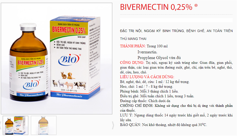 CÔNG DỤNG: Điều trị các bệnh nội ký sinh như giun đũa, giun phổi, giun thận, các loại giun tròn đường ruột và các ngoại ký sinh trùng như cái ghẻ, chí, rận ở bê, nghé, thỏ, dê, cừu, heo, chó.