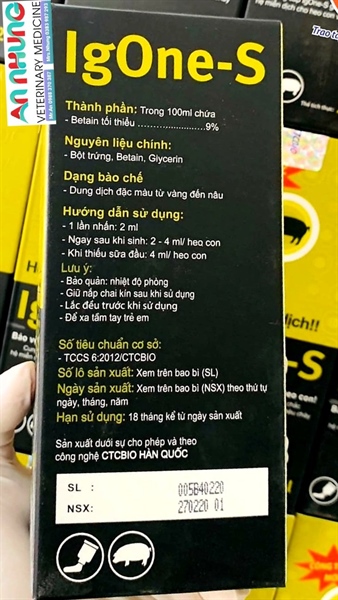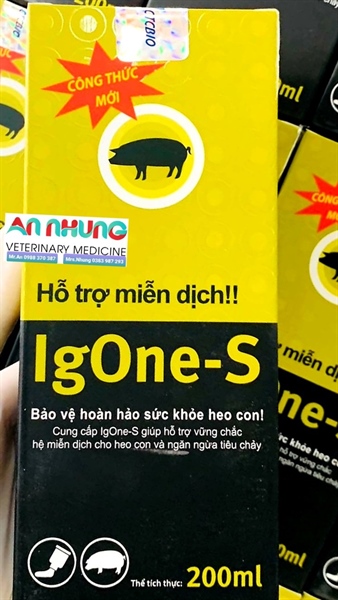 IGONE – S Xuất xư: Hàn QuốcQuy cách : Chai 200mlTiêu chảy là hội chứng thường gặp ở heo con ở hầu hết các lứa tuổi, đặc biệt trong giai đoạn heo con theo mẹ Ứng dụng công nghệ sản xuất kháng thể từ lòng đỏ trứng gà, giúp phòng ngừa hữu hiệu các bệnh tiêu chảy do virus và vi khuẩn trên heo con theo mẹ Kích thích miễn dịch, phòng ngừa stress IG ONE – S còn sử dụng trong trường hợp heo con bị thiếu sữa đầu, hoặc tăng cường đề kháng khi bấm nanh – đuôi Sử dụng ngay cho heo con khi mới sinh là cách phòng ngừa tốt nhất