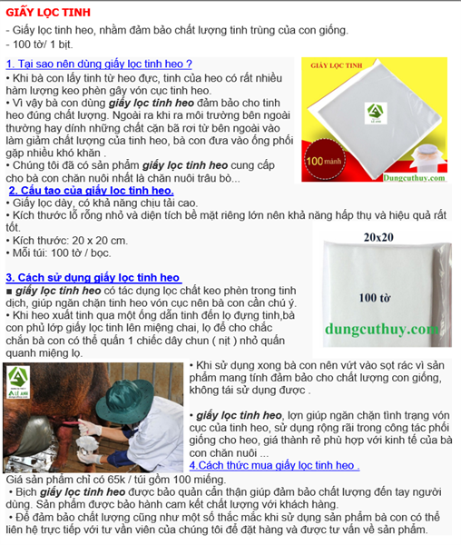 GIẤY LỌC TINH- Giấy lọc tinh heo, nhằm đảm bảo chất lượng tinh trùng của con giống.- 100 tờ/ 1 bịt.1. Tại sao nên dùng giấy lọc tinh heo ?• Khi bà con lấy tinh từ heo đực, tinh của heo có rất nhiều hàm lượng keo phèn gây vón cục tinh heo.• Vì vậy bà con dùng giấy lọc tinh heo đảm bảo cho tinh heo đúng chất lượng. Ngoài ra khi ra môi trường bên ngoài thường hay dính những chất cặn bã rơi từ bên ngoài vào làm giảm chất lượng của tinh heo, bà con đưa vào ống phối gặp nhiều khó khăn . 2. Cấu tạo của giấy lọc tinh heo.• Giấy lọc dày, có khả năng chịu tải cao.• Kích thước lỗ rỗng nhỏ và diện tích bề mặt riêng lớn nên khả năng hấp thụ và hiệu quả rất tốt.• Kích thước: 20 x 20 cm.• Mỗi túi: 100 tờ / bọc. 3. Cách sử dụng giấy lọc tinh heo ■ giấy lọc tinh heo có tác dụng lọc chất keo phèn trong tinh dịch, giúp ngăn chặn tinh heo vón cục nên bà con cần chú ý.• Khi heo xuất tinh qua một ống dẫn tinh đến lọ đựng tinh,bà con phủ lớp giấy lọc tinh lên miệng chai, lọ để cho chắc chắn bà con có thể quấn 1 chiếc dây chun ( nịt ) nhỏ quấn quanh miệng lọ. • Khi sử dụng xong bà con nên vứt vào sọt rác vì sản phẩm mang tính đảm bảo cho chất lượng con giống, không tái sử dụng được . 4.Cách thức mua giấy lọc tinh heo .Giá sản phẩm chỉ có 65k / túi gồm 100 miếng. • Bịch giấy lọc tinh heo được bảo quản cẩn thận giúp đảm bảo chất lượng đến tay người dùng. Sản phẩm được bảo hành cam kết chất lượng với khách hàng. • Để đảm bảo chất lượng cũng như một số thắc mắc khi sử dụng sản phẩm bà con có thể liên hệ trực tiếp với tư vần viên của chúng tôi để đặt hàng và được tư vấn về sản phẩm.