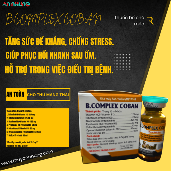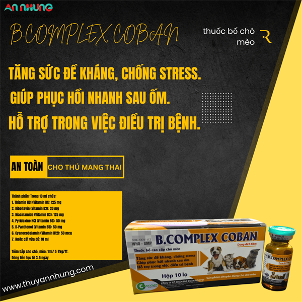 B.COMPLEX COBAN là dung dịch tiêm cao cấp chứa phức hợp các Vitamin nhóm B thiết yếu. Sản phẩm là giải pháp hoàn hảo giúp thú cưng của bạn tăng cường trao đổi chất, nâng cao hệ miễn dịch và phục hồi thể trạng nhanh chóng, đặc biệt là sau những giai đoạn mệt mỏi hoặc thay đổi môi trường sống.