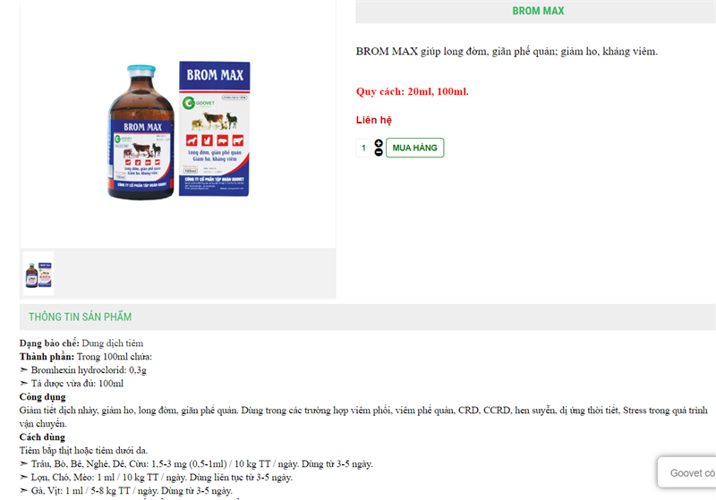 Giảm tiết dịch nhày, giảm ho, long đờm, giãn phế quản. Dùng trong các trường hợp viêm phổi, viêm phế quản, CRD, CCRD, hen suyễn, dị ứng thời tiết, Stress trong quá trình vận chuyển.