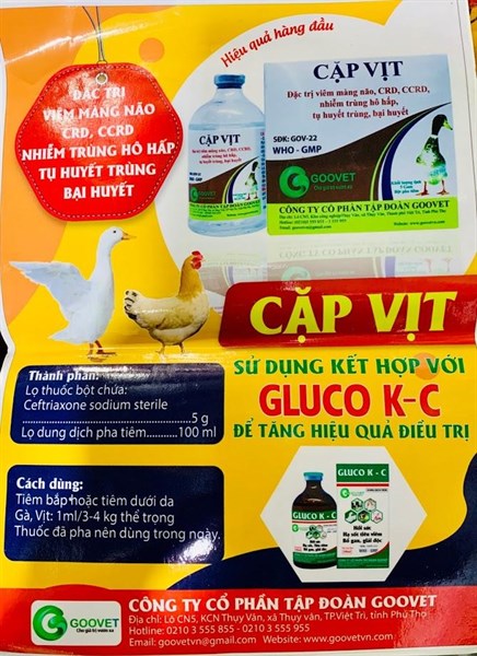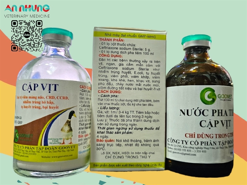 Đặc trị các bệnh thường xảy ra trên vịt, ngan, gia cầm mẫn cảm với Ceftriaxone sodium Sterile như: nhiễm trùng huyết, E.coli, tụ huyết trùng, viêm phổi, viêm khớp, viêm xoang, khò khè, hen, khẹc vịt, sưng phù đầu, chảy nước mắt nước mũi, viêm đường tiết niệu và bại huyết ở vịt.