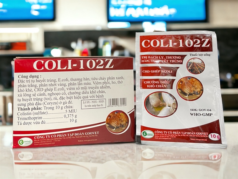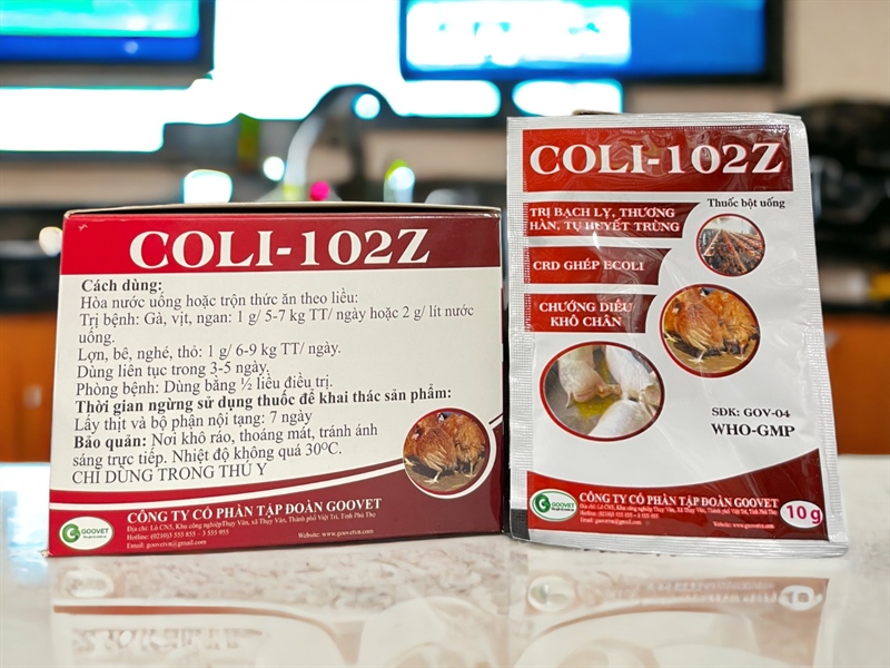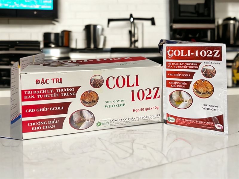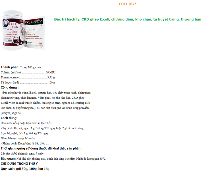 COLI 102Z – Đặc trị bạch lỵ, CRD ghép E.coli, chướng diều, khô chân, tụ huyết trùng, thương hàn.