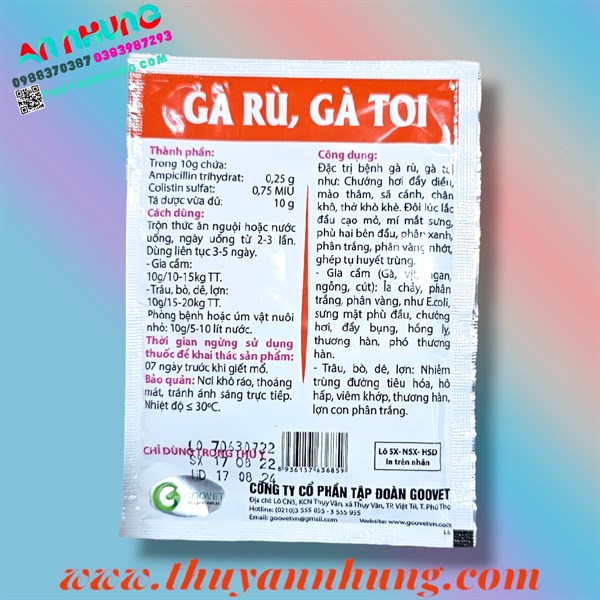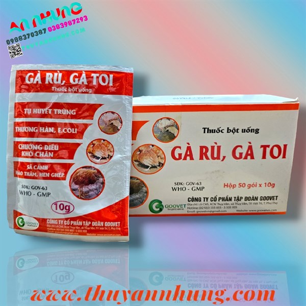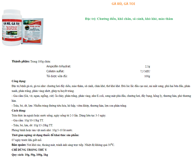 Đặc trị bệnh gà rù, gà toi như: chướng hơi đầy diều, mào thâm, sã cánh, chân khô, thở khò khè. Đôi lúc lắc đầu cạo mỏ, mí mắt sưng, phù hai bên đầu, phân xanh, phân trắng, phân vàng nhớt, ghép tụ huyết trùng.