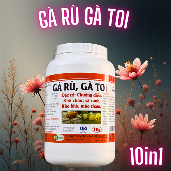 Đặc trị bệnh gà rù, gà toi như: chướng hơi đầy diều, mào thâm, sã cánh, chân khô, thở khò khè. Đôi lúc lắc đầu cạo mỏ, mí mắt sưng, phù hai bên đầu, phân xanh, phân trắng, phân vàng nhớt, ghép tụ huyết trùng.