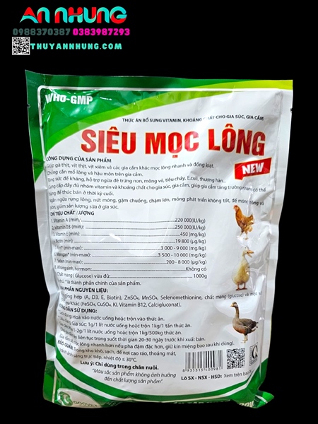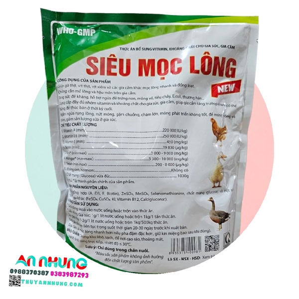 Công dụng sản phẩm:Giúp gà vịt, vịt thịt, vịt xiêm và các gia cầm khác mọc lông nhanh và đồng loạt.Chống cắn mổ lông và hậu môn trên gia cầm.Hỗ trợ ngừa tiêu chảy, Ecoli, thương hàn…