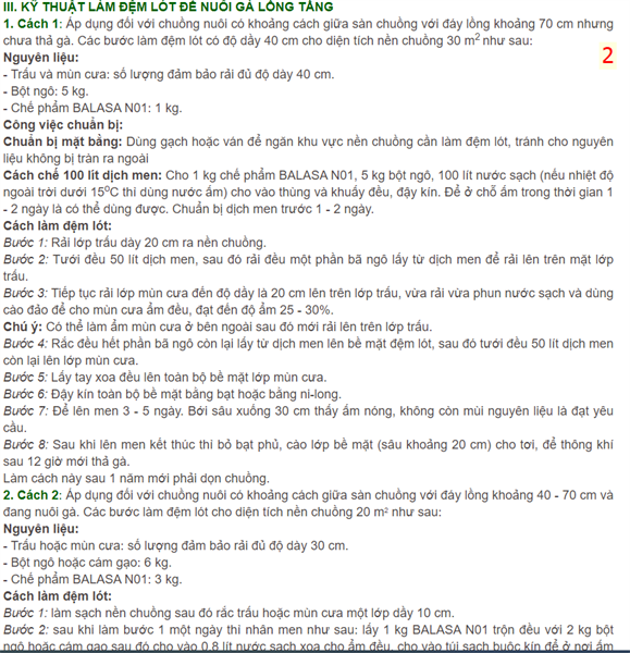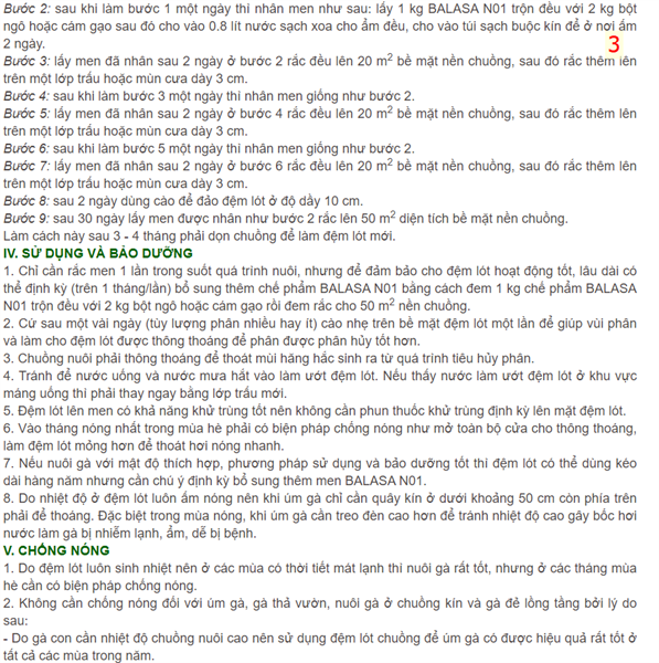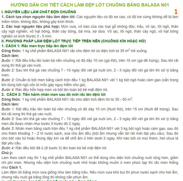 – 1kg chế phẩm BALASA-N01 sẽ làm đệm lót cho diện tích chuồng nuôi từ 35 – 50 m2.2. Làm đệm lót có diện tích chuồng từ 35 m2 trở xuống theo các bước sau:– Bước 1: Rải trấu lên toàn bộ nền chuồng dầy 10cm (gà thịt) hoặc trên 15cm (gà đẻ), sau đó thả gà vào nuôi.– Bước 2: Sau một thời gian (sau 7-10 ngày đối với gà nuôi úm, sau 2-3 ngày đối với gà lớn) quan sát thấy khi nào phân rải khắp trên bề mặt chuồng thì rắc men.– Cách rắc men: Lấy 1kg BALASA-N01 đem trộn thật đều với 1 kgbột ngô (có thể là cám gạo, bột sắn hay bột ngô đều được), sau đó đem rắc đều len toàn bộ bề mặt độn lót là được.3. Làm đệm lót có diện tích nền chuồng từ 35 – 50 m2:– Tiến hành các bước 1 và 2 như trên, chỉ khác ở cách rắc men: + Đem1kg chế phẩm BALASA-N01 trộn đều với 3kg bột ngô hoặc cám gạo, cho thêm khoảng 1,2 lít nước sạch, xoa cho ẩm đều (bột phải ẩm nhưng vẫn tơi rời mới đạt yêu cầu), sau đó cho vào túi hoặc thùng đậy kín và để chỗ ẩm ủ trên dưới 2 ngày, khi nào có mùi thơm hơi chua thì đem rắc đều lên toàn bộ bề mặt độn lót.– Chú ý: + Thực hiện làm đệm lót có diện tích nền chuồng từ 35 – 50 m2 phải trộn BALASA-N01 với bột ẩm ủ trong điều kiện ấm để lên men với mục đích làm ang lượng men do đó làm ang hiệu quả sử dụng trên diện tích chuồng nuôi rộng và giảm chi tiền men.– Làm đệm lót bằng mùn cưa giống như làm bằng trấu. Nếu mùn cưa khô bụi thì phun nước sạch cho hơi ẩm. Làm đệm lót nuôi vịt, ngan bằng mùn cưa và cần dầy hơn. 4. Phương pháp sử dụng và bảo dưỡng:– Chỉ cần rắc men một lần trong suốt quá trình nuôi.– Cứ sau một vài ngày (tùy lượng phân nhiều hay ít) cào nhẹ trên bề mặt đệm lót một lần để giúp vùi phân và làm cho đệm lót được thông thoáng để thoát mùi ang hắc do tiêu hủy phân sinh ra.– Tránh làm đệm lót bị ướt (nước uống và nước mưa hắt…). Nếu thấy nước rớt làm ướt đệm lót ở khu vực máng uống thì phải thay ngay bằng lớp trấu mới.– Đệm lót lên men có sự khử trùng tốt nên không cần phun thuốc khử trùng định kỳ lên mặt đệm lót.– Ở tháng nóng nhất trong mùa hè phải có biện pháp chống nóng.– Nếu nuôi với mật độ gà thích hợp, phương pháp sử dụng và bảo dưỡng tốt thì đệm lót có thể kéo dài hàng năm. 5. Chú ý trong việc chống nóng:– Vấn đề tồn tại lớn nhất cần giải quyết khi nuôi gà trên đệm lót lên men là việc chống nóng trong mùa hè. Do đệm lót luôn sinh nhiệt nên ở các mùa có thời tiết mát lạnh thì nuôi gà rất tốt hoặc ở tháng có nhiệt độ không quá nóng mà có biện pháp chống nóng tốt cũng sẽ ảnh hưởng nhiều.– Vấn đề chống nóng cũng không đặt ra đối với úm gà và nuôi gà đẻ lồng tầng ở chuồng kín. Bởi vì:– Do gà con cần nhiệt độ chuồng nuôi cao nên làm đệm lót lên men chuồng để úm gà sẽ có được hiệu quả rất tốt ở tất cả các mùa trong năm.– Nuôi gà đẻ lồng tầng ở chuồng kín cũng có thể duy trì đệm lót chuồng quanh năm, gà không trực tiếp sống trên đệm lót.– Chống nóng trong mùa hè chủ yếu đối với gà nuôi thịt, gà đẻ trên nền chuồng láng xi măng hoặc lát gạch. Cụ thể:– Cần mở hết cửa cho thông thoáng, nếu cần phải dùng quạt hơi nước để thoát hơi nóng và làm mát chuồng nuôi, tránh bị om nhiệt trong chuồng làm cho gà bị sỉu, có thể bị chết.– Trong trường hợp không có biện pháp chống nóng tốt thì trong vài tháng nóng nhất có thể thực hiện nuôi trên đệm lót mỏng định kỳ thay mới. Chú ý: nếu nên chuồng là đất nện thì cần lót ni lông để thu phân cho dễ và tránh nền bị nhiểm bẩn. * Nguyên liệu để làm đệm lót sinh thái là các nguồn chất xơ, mùn cưa, bột ngô, bã sắn… Nếu việc mua mùn cưa quá khó khăn thì người chăn nuôi có thể sử dụng các nguồn chất xơ khác thay thế như: bột ngô, bã sắn …