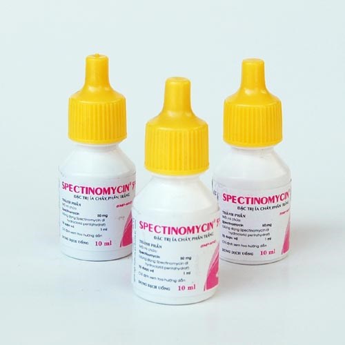 Spectinomycin 5%Đặc trị phân xanh, phân trắng, các bệnh về đương ruộtTHÀNH PHẦNMỗi ml chứa Spectinomycin 50 mg (dùng dạng Spectinomycin dihydroclorid pentahydrat) Tá dược vđ 1 mlCHỈ ĐỊNH- Phòng và đặc trị viêm ruột-ỉa chảy, ỉa phân trắng, nhiễm E.coli huyết, sưng phù đầu, phó thương hàn ở lợn con: Bệnh lỵ và hồng lỵ.- Các bệnh đường hô hấp: Suyễn, viêm phổi phế, tụ huyết trùng, viêm màng hoạt dịch ở lợn con sơ sinh, bê, nghé, dê non.LIỀU LƯỢNG VÀ CÁCH DÙNG- Vặn van ngược chiều kim đồng hồ cho van nâng cao.- Bơm trực tiếp vào góc miệng. Mỗi lần nhấn tương đương 1ml.Liều phòng: Dùng liều duy nhất 3ml/con, càng sớm càng tốt sau khi sinh.Liều chữa: 1ml/2 kg TT. Ngày uống 2 lần.Dùng liên tục 3-5 ngày.Thời gian giết mổ: Sau 5 ngày.BQ: Nơi khô, mát, tránh ánh sáng.HSD: 18 tháng kể từ ngày sản xuấtQuy cách: Lọ 10ml, 100ml và 200ml.