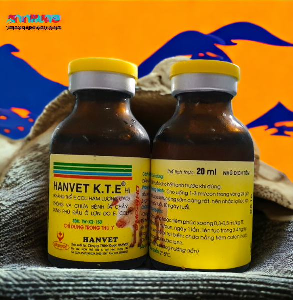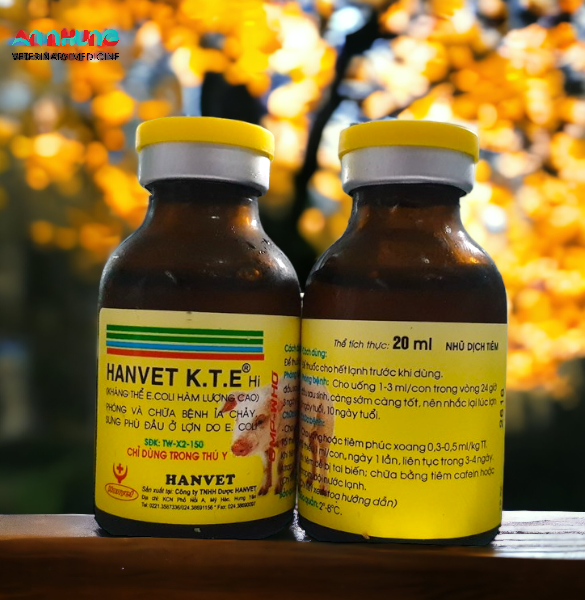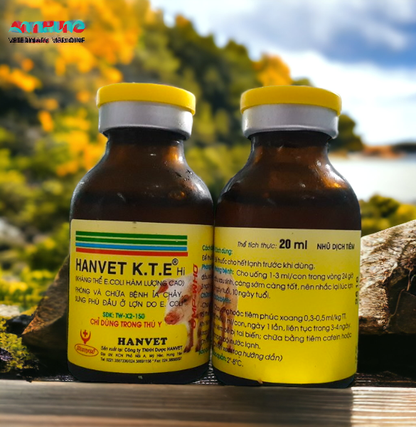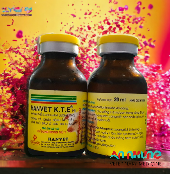 HANVET K.T.E® Hi là chế phẩm sinh học độc đáo, sản xuất theo công nghệ tiên tiến, hiện đại, với thành phần là kháng thể đặc hiệu hàm lượng cao và kháng độc tố của nhiều chủng vi khuẩn E.coli độc được phân lập ở Việt Nam. HANVET K.T.E® Hi có tác dụng nhanh, mạnh, đặc hiệu, gây ngưng kết, tiêu diệt và trung hòa độc tố E.coli… giúp phòng, chữa trị bệnh tiêu chảy và sưng phù đầu do E.coli gây nên ở lợn con.