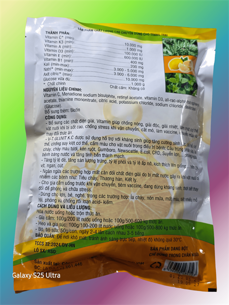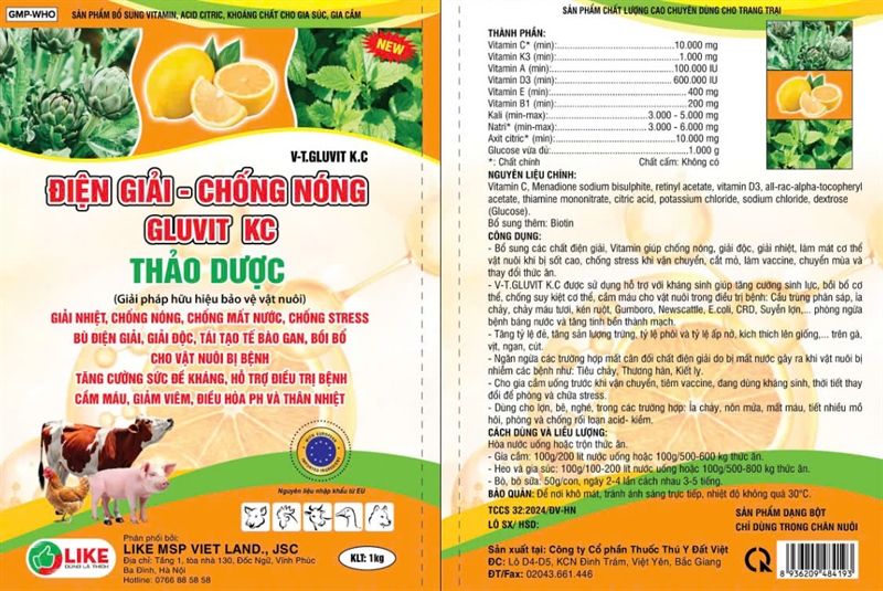 - Tăng cường sức đề kháng (Vitamin C, V-TGLUVIT K.C): Hỗ trợ vật nuôi tăng cường sức đề kháng, chống suy kiệt cơ thể, cầm máu, và phục hồi nhanh chóng sau bệnh.