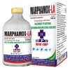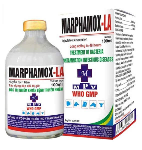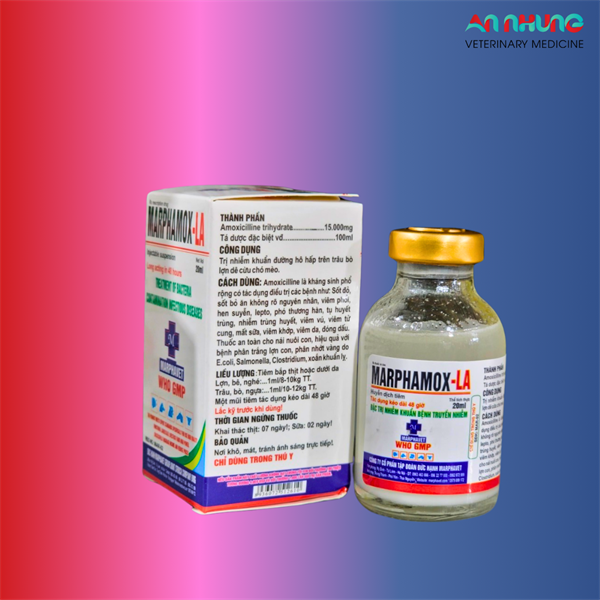 Đặc trị nhiễm khuẩn kế phát của các bệnh truyền nhiễm như: Sốt đỏ (tai xanh, PRRS), bỏ ăn không rõ nguyên nhân, viêm phổi, khó thở, lepto, phó thương hàn, tụ huyết trùng, nhiễm trùng huyết sau khi sinh.THÀNH PHẦN CÓ TRONG MAR MARPHAMOX LA 100ML:Amoxicilline (as trihydrate)Tá dược đặc biệt (axit Clavulalic) dung môi hữu cơ vừa đủCÔNG DỤNG CỦA THUỐC MAR MARPHAMOX LA 100ML:Đặc trị nhiễm khuẩn kế phát của các bệnh truyền nhiễm như: Sốt đỏ (tai xanh, PRRS), bỏ ăn không rõ nguyên nhân, viêm phổi, khó thở, lepto, phó thương hàn, tụ huyết trùng, nhiễm trùng huyết sau khi sinh.Bệnh viêm vú mất sữa, MMA, viêm tử cung, an toàn cho nái nuôi con, viêm khớp, viêm da, đóng dấu.Thuốc hiệu quả với bệnh phân trắng lợn con, phân nhớt vàng do E.coli, Clostridium, xoắn khuẩn lỵ.LIỀU LƯỢNG VÀ CÁCH DÙNG CỦA THUỐC MAR MARPHAMOX LA 100ML:Sử dụng Mar Marphamox LA 100ml để:Tiêm sâu bắp thịt hoặc dưới daLợn, bê, nghé………1ml/8-10kgTTTrâu, bò, ngựa………1ml/10-12kgTTMột mũi tiêm tác dụng kéo dài 48 giờ. Các lưu ý khi sử dụng thuốc Mar Marphamox LA 100ml:Không dùng cho thú mẫn cảm với thành phần của thuốc.Không dùng quá liều quy địnhĐể xa tầm tay trẻ em.Bảo quản nơi khô thoáng, nhiệt độ không quá 300C, tránh ánh sáng trực tiếp