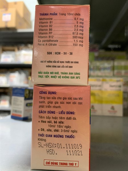 CÔNG DỤNG: Tăng tạo sữa cho chó mèo, gia súc sau sinh và giúp con non c.òi c.ọc phát triển nhanh. Kích thích tăng trọng, tăng tính thèm ăn, trợ sức sau các bệnh truyền nhiễm kí sinh trùng, sản khoa. Đ.iều t.rị suy dinh dưỡng, c.òi c.ọc, thiếu máu, bại liệt, phù thũng do thiếu vitamin B.