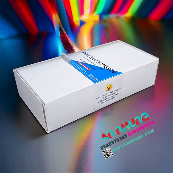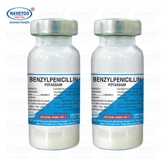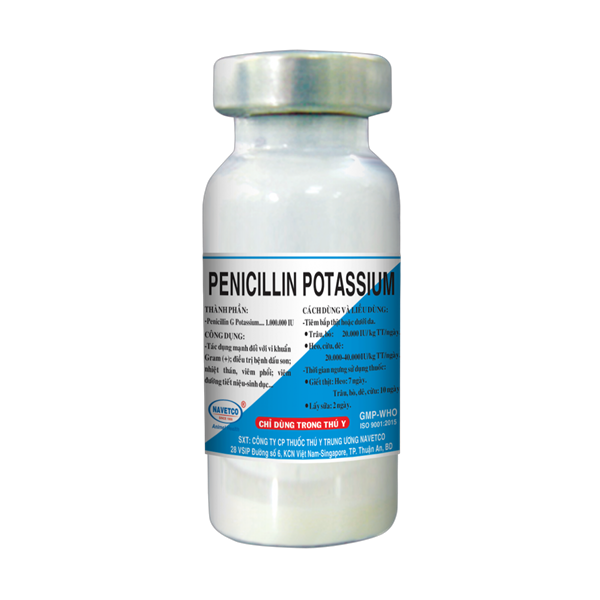 PENICILLIN POTASSIUMThành Phần Hàm Lượng Chức năng chính : Thuốc kháng sinh bột pha tiêm Đối Tượng Sử Dụng : Gia súc, gia cầm Dạng Bào Chế : Bột pha tiêm Quy Cách : Chai: 1.000.000 IU Nhà Sản Xuất : Navetco Nơi Sản Xuất : Việt Nam Thành Phần Hàm Lượng Penicillin G Potassium (Benzylpenicillin Potassium) 1.000.000 IU Công Dụng- Penicillin Potassium có đặc tính tác dụng mạnh mẽ đối với vi khuẩn Gram (+) như: Staphylococcus, Streptococcus, Erysipelothrix, Clostridium, Bacillus, Treponema, Leptospira ,…
