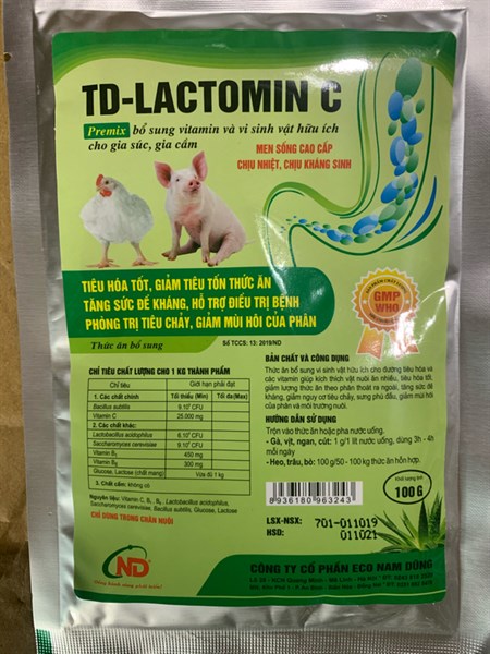 TD-LACTOMIN C là sản phẩm bổ sung vi sinh vật hữu ích (probiotic) và vitamin thiết yếu, được thiết kế đặc biệt để hỗ trợ hệ tiêu hóa, tăng cường miễn dịch và giúp vật nuôi phát triển khỏe mạnh toàn diện. Với công thức độc đáo, sản phẩm không chỉ giúp vật nuôi ăn nhiều, tiêu hóa tốt mà còn giải quyết triệt để các vấn đề như tiêu chảy và mùi hôi trong chuồng trại.