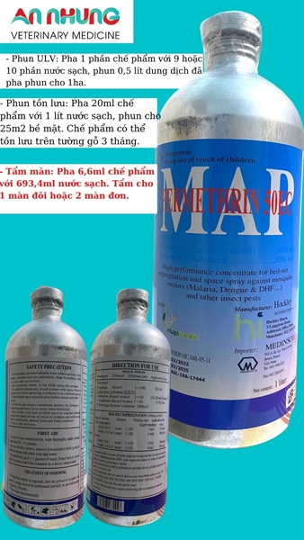 – Thuốc diệt trừ muỗi Map Permethrin 50EC là hóa chất diệt côn trùng có thành phần permethrin 50%, dạng nhũ dầu đậm đặc, màu vàng nhạt, mùi hắc nhẹ.