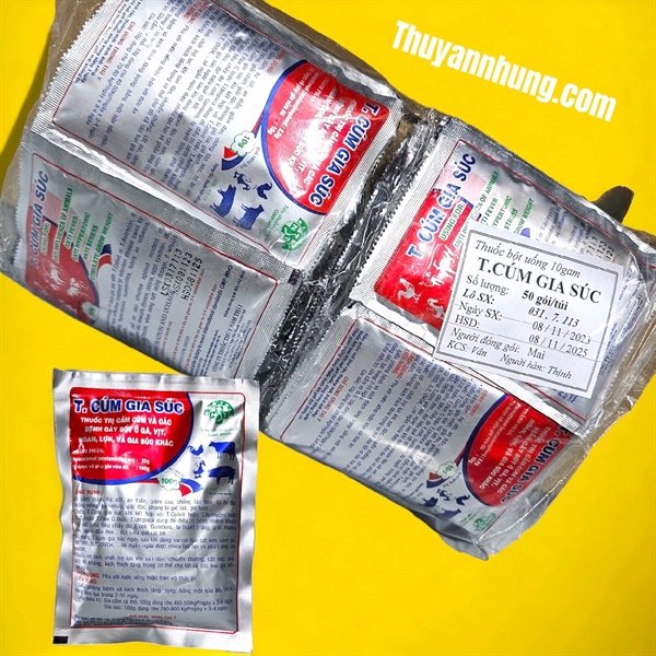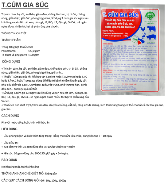 + Trị cảm cúm, hạ sốt, an thần, giảm đau, chống táo bón, trị bí đái, chống nóng, giải nhiệt, giải độc, phòng bị gió lùa, gió lạnh…+ Thuốc T.cúm gia súc khi kết hợp với T.colivit hoặc T.Avimycin hoặc T.I.C hoặc T.flox.C hoặc T.umgiaca dùng để điều trị bệnh nhiễm khuẩn gây sốt như tiêu chảy do E.coli, Gumboro, tụ huyết trùng, phó thương hàn, bệnh đầu đen… đạt hiệu quả rất tốt.+ Sử dụng T.cúm gia súc ngay sau khi dùng vacxin Niu cát xơn, cúm gà, IB, IBD, ILT, đậu gà, OVO4,…sẽ ngăn ngừa được nhiều tác hại và phản ứng của Vacxin.+ Thuốc có tính chất trợ lực khi san đàn, chuyển chuồng, cắt mỏ, tăng sức đề kháng, kích thích tăng trọng cơ thể cho tất cả các loại gia súc, gia cầm.