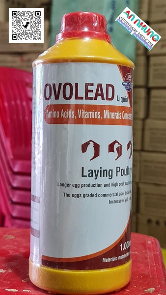 CÔNG DỤNG:Bổ sung acid amin, vitamin, khoáng thiết yếu cho gia cầm, thủy cầm, chim cút.Cải thiện chất lượng trứng: Trứng đạt kích cỡ thương phẩm, vỏ dày, tăng chỉ số lòng đỏ, chỉ số Haugh.Nâng cao sản lượng trứng; Kéo dài thời gian khai thác trứng và duy trì đẻ đỉnh cao; Hạn chế giảm đẻ đột ngột.Tăng tỉ lệ trứng có phôi và ấp nở.CÁCH DÙNG:Lắc đều trước khi sử dụngHòa OVOLEAD vào nước uống sạch và cho uống.Hòa OVOLEAD vào nước sạch vừa đủ, phun đều lên thức ăn, để thấm rồi cho ăn.LIỀU DÙNG:Thường xuyên: 1 ml/ 2-3 lít nước hoặc 1-1,5 kg thức ăn hoặc 10-20 kg thể trọng/ ngày.Giai đoạn mái suy nhược: Dùng gấp đôi liều thường xuyên.